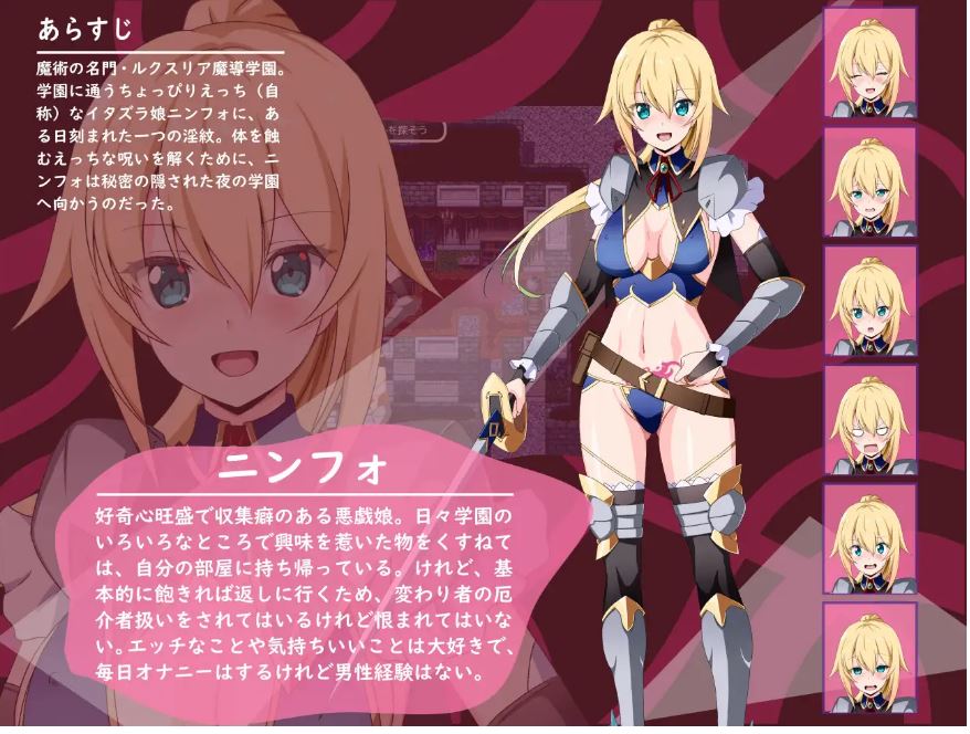 就读于学园的小恶魔系色气少女(自称)宁芙,某日被刻上了一道淫纹。为了解除侵蚀身体的色气诅咒,她踏入了隐藏着秘密的夜间学园……